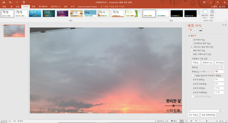 [디자인] 탭 - [배경 서식] - [투명도] 를 선택해줍니다. 그럼 끝! 아래처럼 배경이 설정한 투명도에 따라 투명해집니다. 저는 보통 25~30%로 맞춰요.